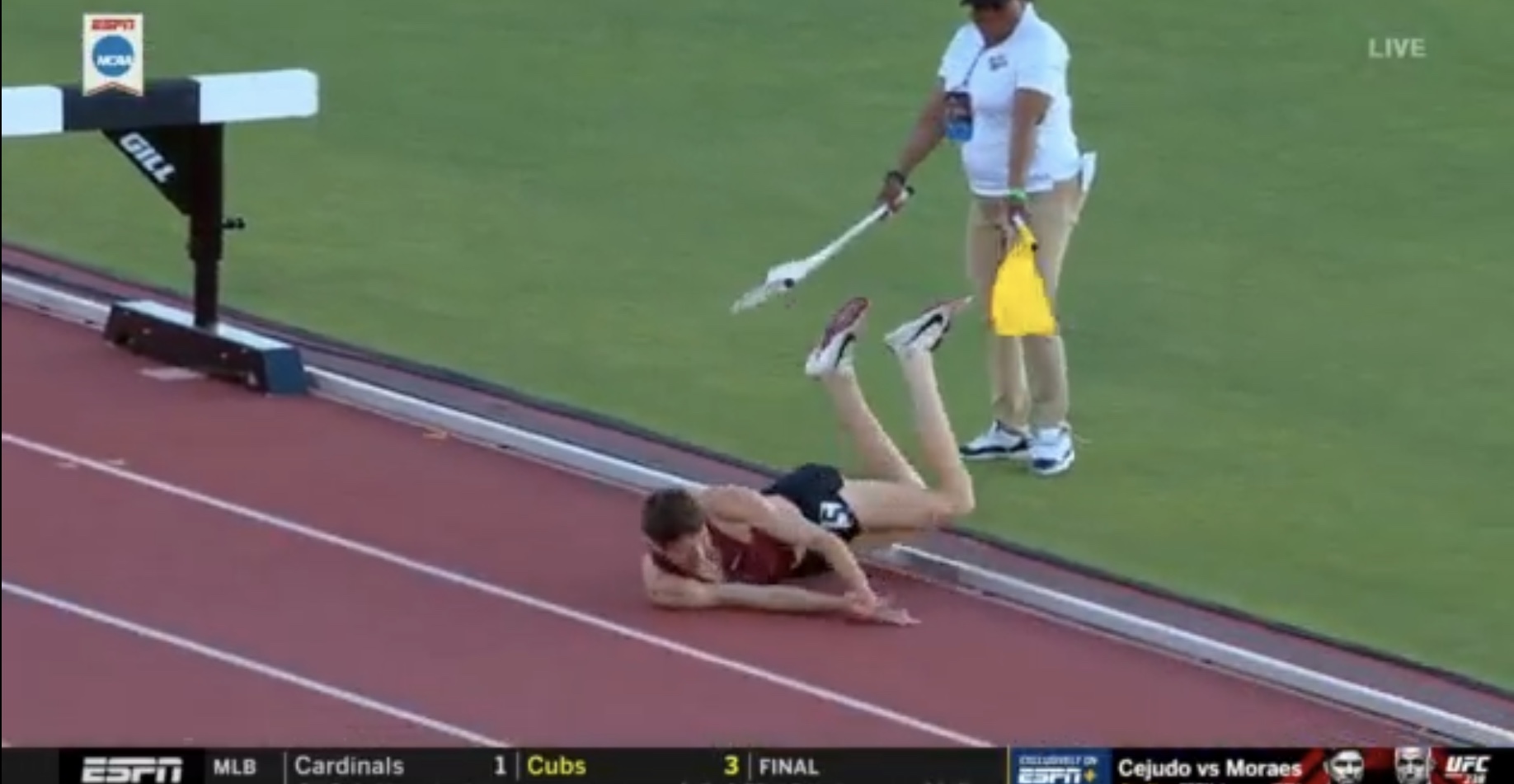 I have no idea why the commentators didn't pick up on the cause of the injury. The coverage showed the replay of El Bakkaili's fall just after the race ended. I knew Paul Swangard would be totally clueless. In real time he barely mentioned El Bakkali's injury at all, waiting nearly a half lap to notice. He didn't raise his voice at all or emphasize the significance. Then he cut off Des Linden when she was trying to make a related point. Swangard thought it was more important to describe the lead order than to focus on the Olympic champion going down.