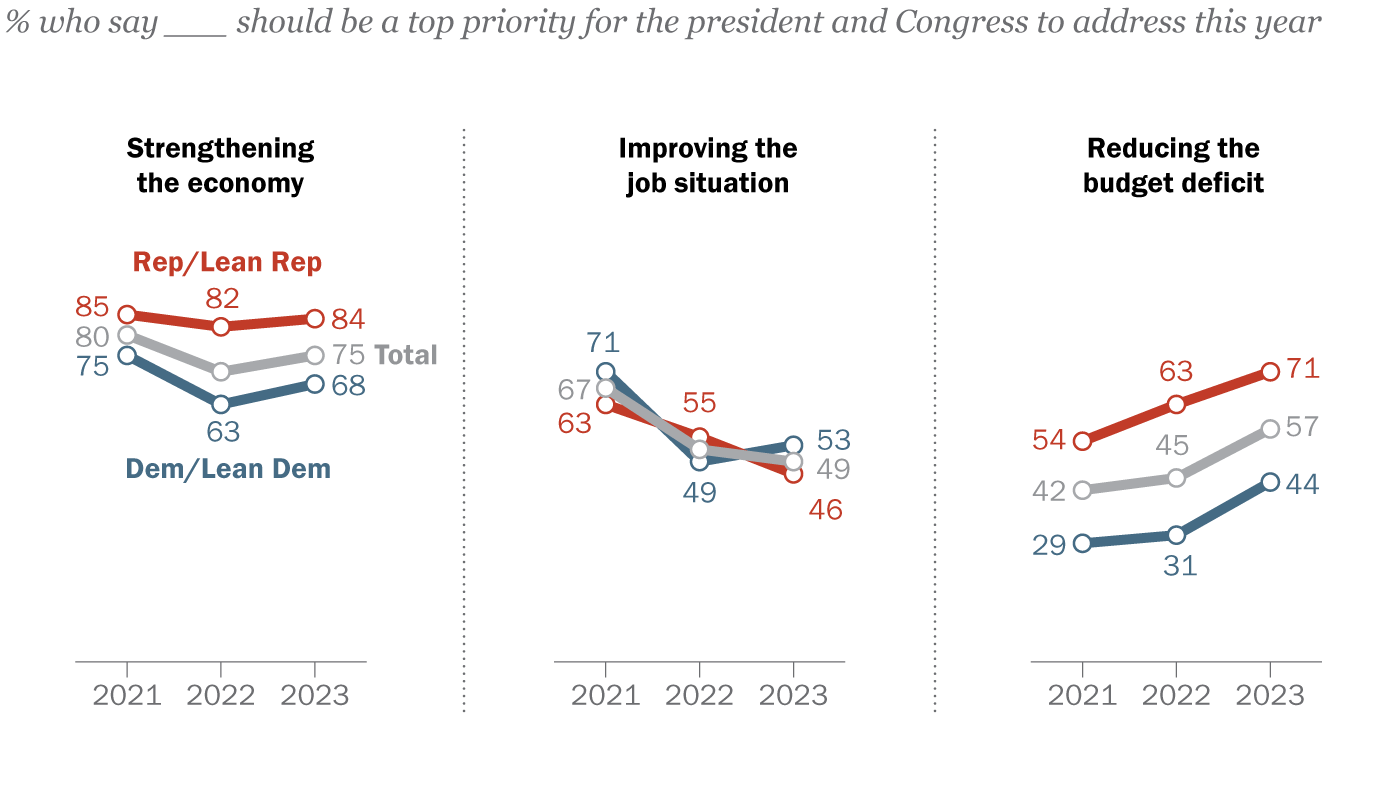 Americans now see reducing the budget deficit as a higher priority for the president and Congress to address than in recent years. But strengthening the economy continues to be the public’s top policy priority.