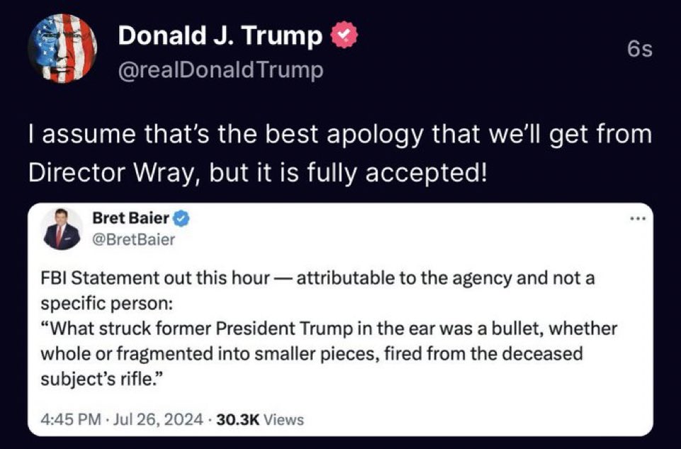 Ok I'm gonna come out predict Trump lied about being hit by a bullet. This quote made it clear to me. He points to the hospital calling it a bullet wound. The immediate instinct of putting the blame on someone else gave it away.