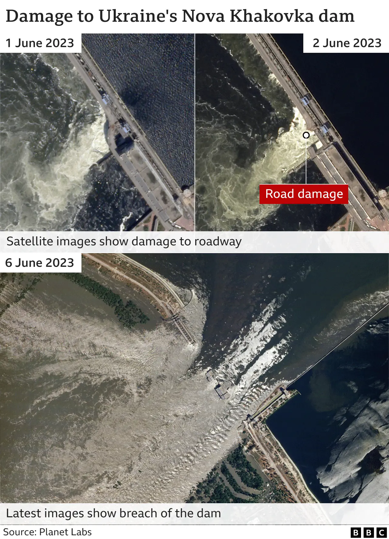 Losing the dam is a huge loss for Ukraine on many levels. Militarily, the Dnipro around Kherson is now impossible to cross using temporary pontoon bridges. The river is too wide. Just look at the satellite before and after photos. Ukraine is now completely cut off from being able to advance towards Crimea from Kherson. But Russian forces are still able to shell Kherson from the Russian held side of the Dnipro and are actually attacking civilian evacuation sites with artillery. And by far the biggest disadvantage for Ukraine is that the dam was also a bridge and the only bridge still standing on the southern front around Kherson. If Ukraine was able to capture the dam, they would have been able to move armored divisions across the Dnipro very quickly instead of risky and slow crossings across temporary pontoon bridges. With the dam blown, Ukraine has no ability to launch counteroffensives on its southern front at Kherson and will probably not be able to reach Crimea absent a catastrophic collapse of RU defenses.